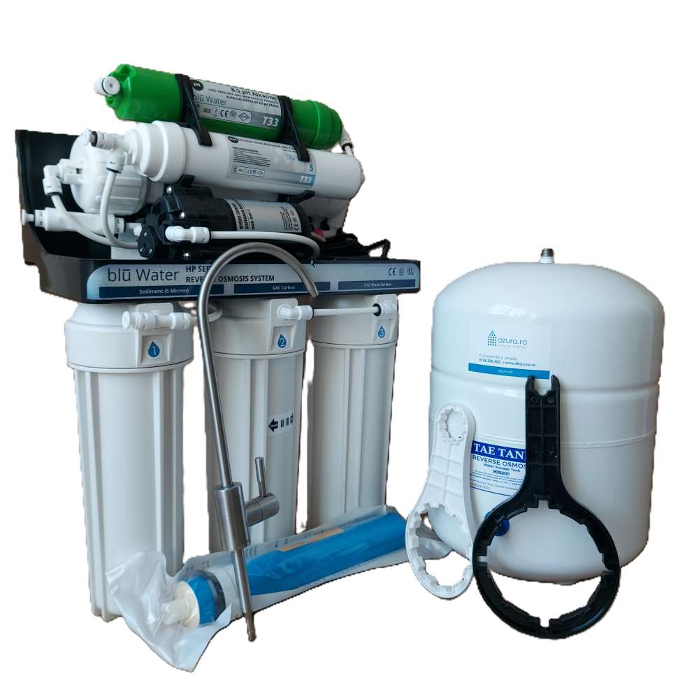 Filtru cu osmoza inversa OSMOAZURA BLU HP75-AG, ALCALIN, ce incorporeaza cartuse filtrante impregnate cu nano argint si filtru pentru alcalinizare si remineralizare.